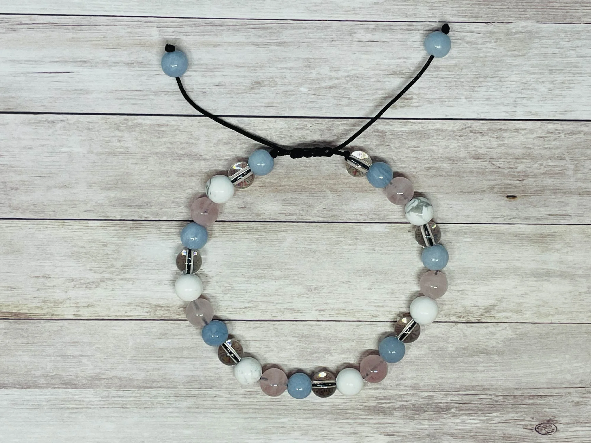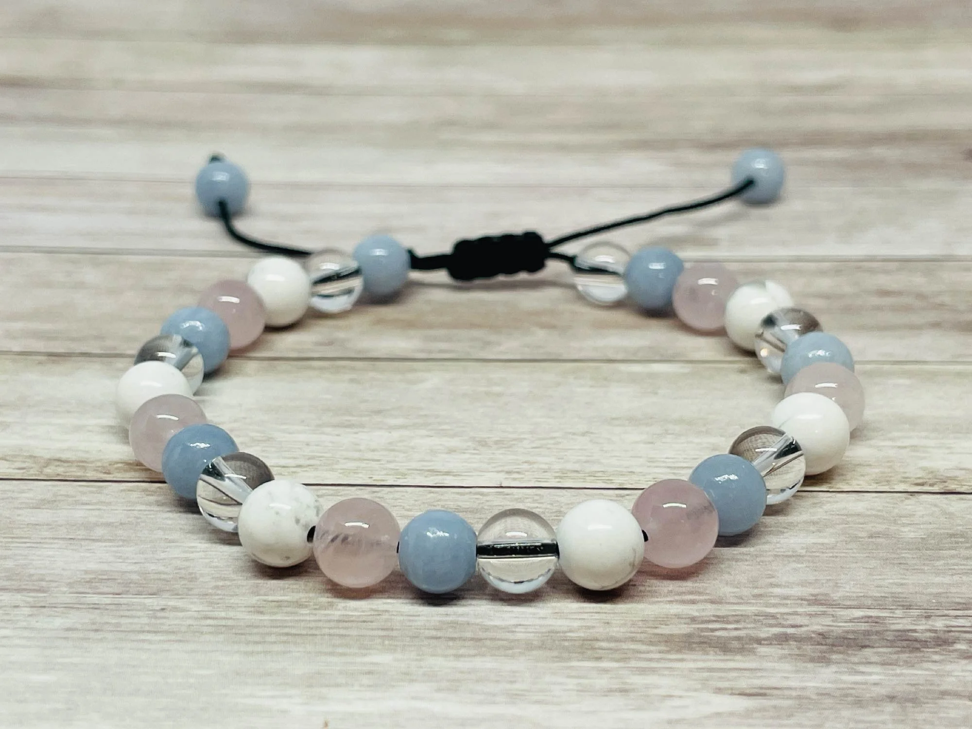 Découvrez le bracelet en Quartz Rose, Howlite, Angélite et Cristal de Roche, un bijou confectionné avec soin, qui allie esthétique et bienfaits thérapeutiques. Sur un cordon ajustable disponible dans plusieurs couleurs, ce bracelet est conçu pour s’adapter parfaitement à votre poignet ou votre cheville. En choisissant ce bijou, vous optez pour une synergie de pierres qui vous apportera réconfort et apaisement au quotidien.